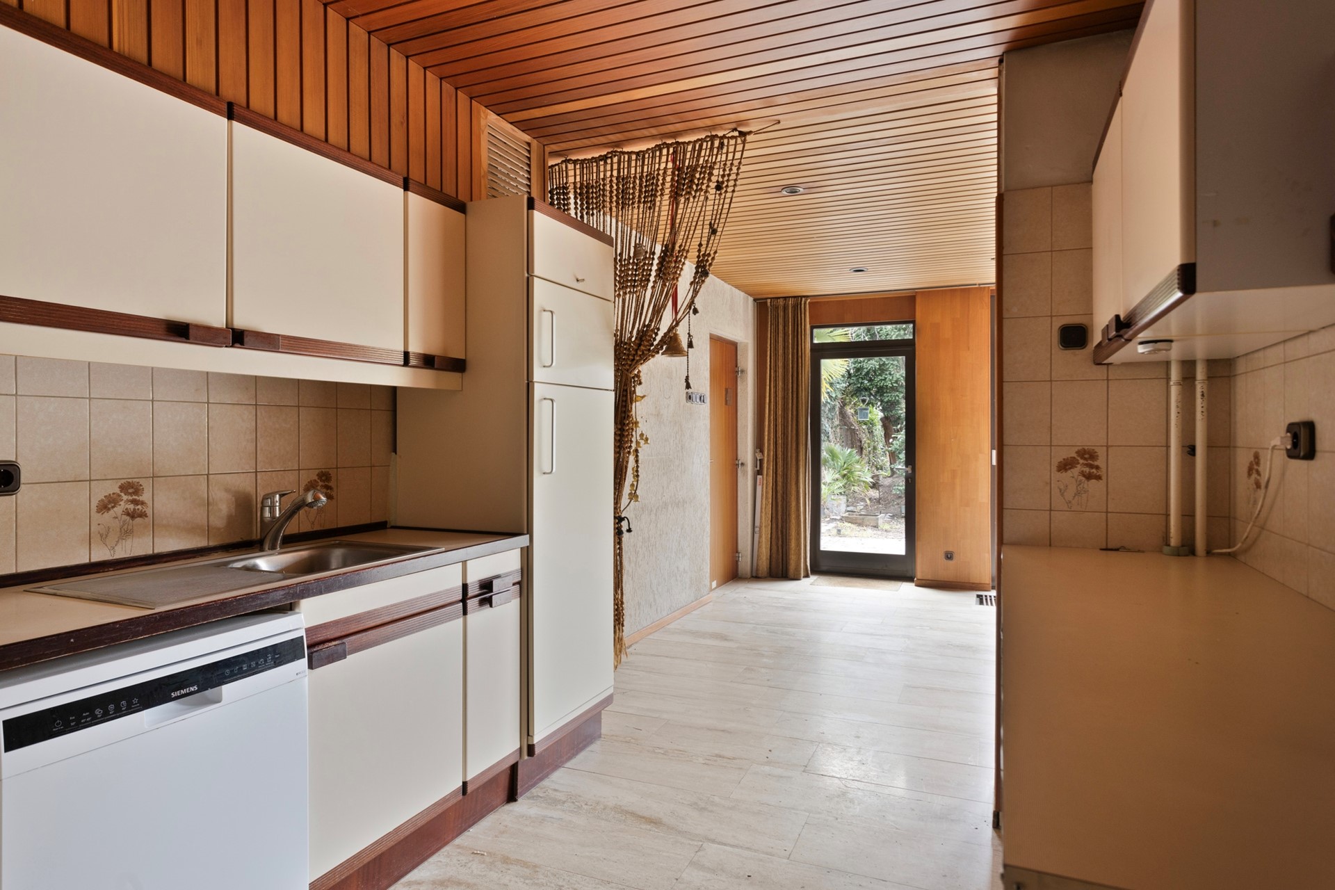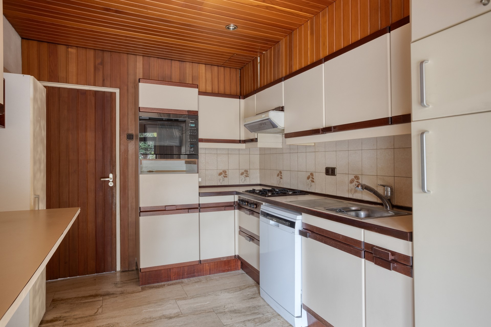 De keuken beschikt over een eenvoudige keukeninstallatie in hoekopstelling met boven- en onderkasten, ontbijtbar, enkele lades en de navolgende apparatuur: spoelbak, koelkast met vriesvak, oven, losse vaatwasser, gaskookplaat met 4 zones en een afzuigkap. Vanuit de keuken is er toegang tot de hal. Vanuit de eetkamer is via een brede schuifpui toegang tot de tuin en via een toegangsdeur is de garage bereikbaar.