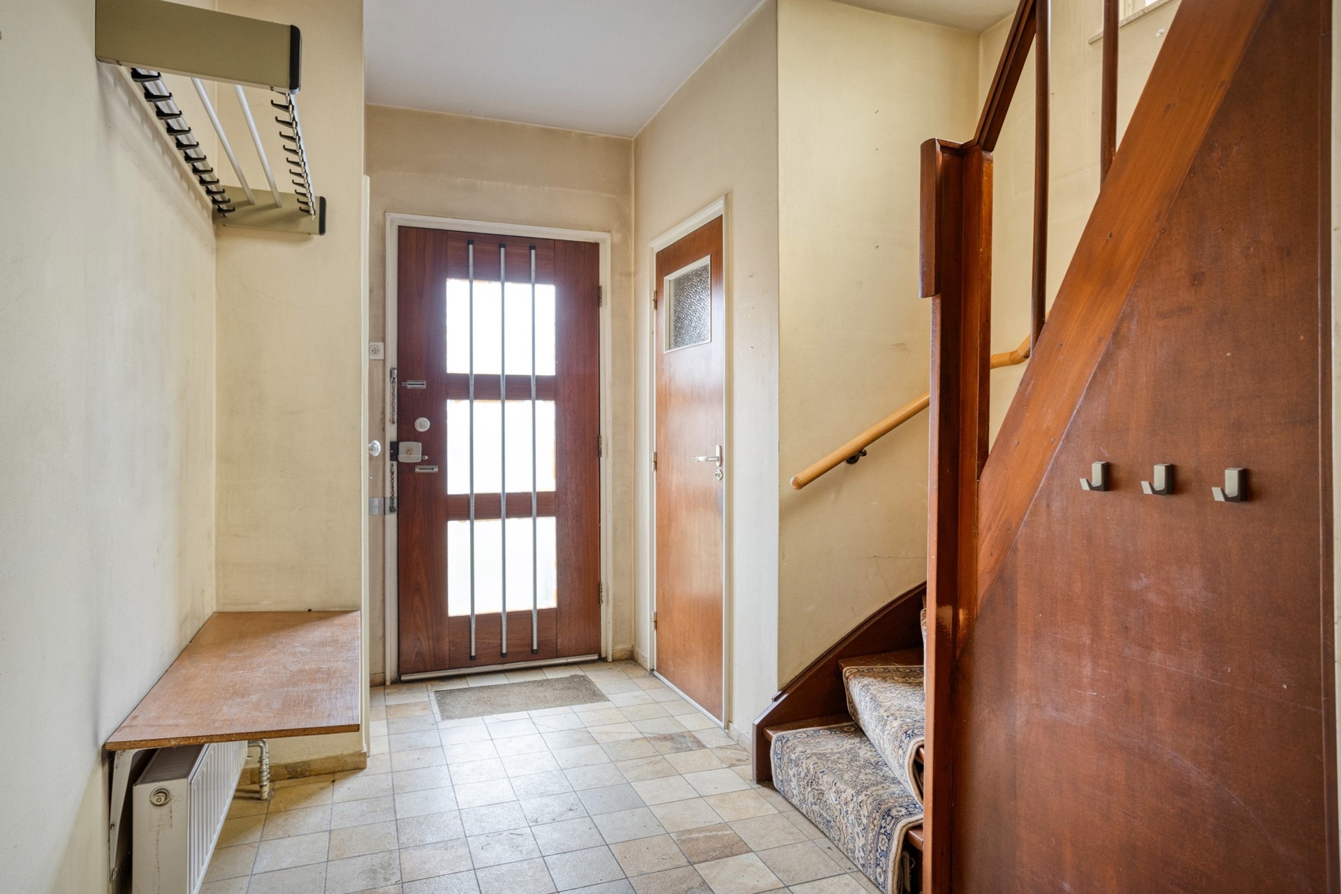 Ontvangsthal (ca. 8,5m²) met trapopgang, meterkast (4 groepen, 1 aardlekschakelaar en slimme meter), garderobe, toilet en toegang tot het souterrain, de keuken en de woonkamer. Het toilet is geheel betegeld en beschikt over een wandcloset, fonteintje en een radiator. Riante L-woonkamer (ca. 54m²) met semi-open keuken (ca. 9m²), voorzien van een plavuizen tegelvloer, schouw en convector. De zitkamer is aan de voorzijde van de woning gesitueerd, de eetkamer staat in verbinding met de semi-open keuken en is in de aanbouw en aan de achterzijde van de woning is gerealiseerd. Het plafond is deels gestuukt en deels afgewerkt met schrootjes, voorzien van inbouwspots.