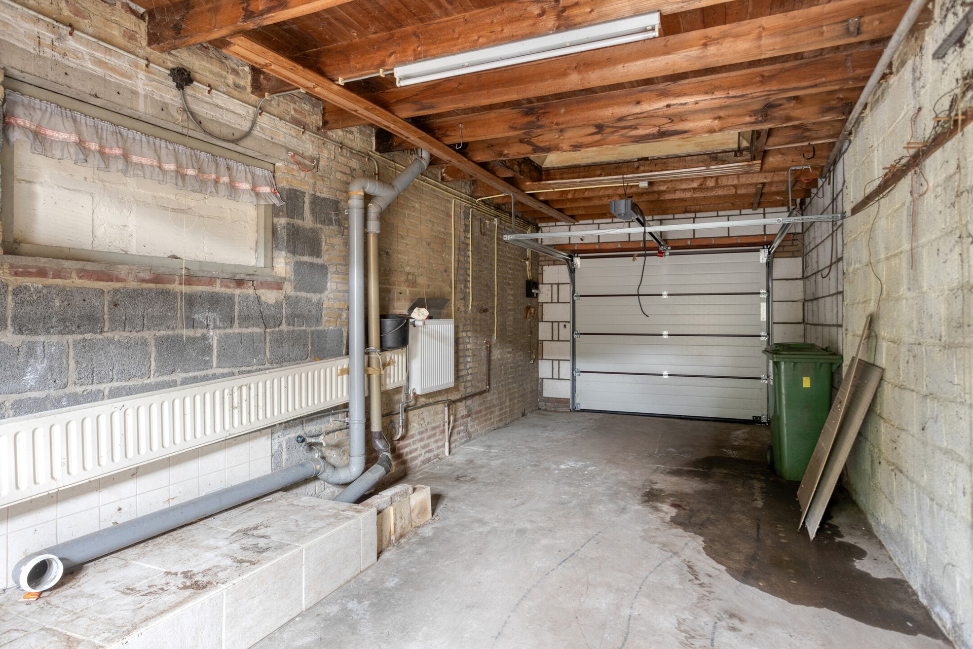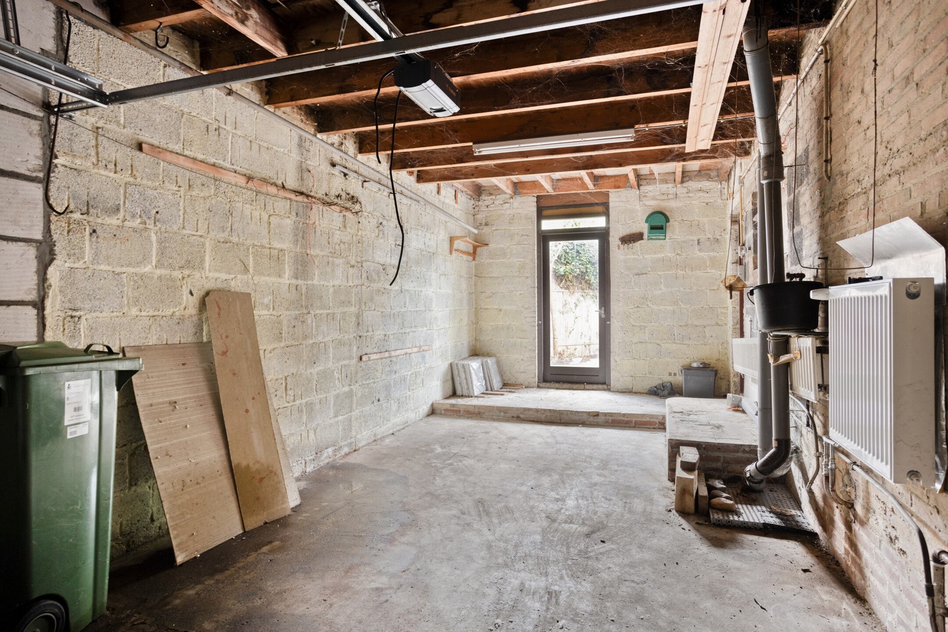 De XL-garage (ca. 26m²) beschikt over licht, elektra, sectionaalpoort en een lichtkoepel. Aan de achterzijde is er toegang naar de tuin.