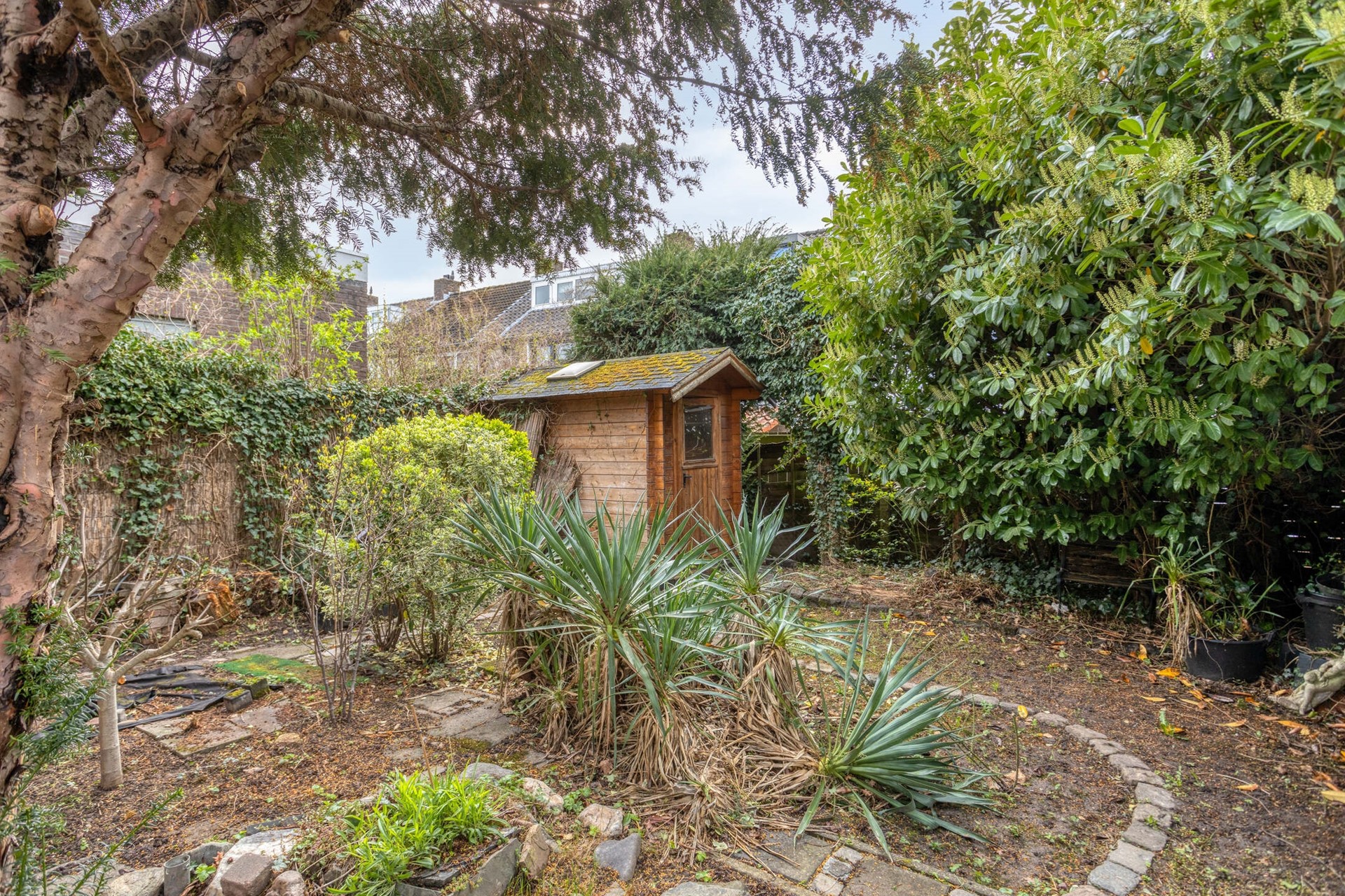Het object beschikt over een diepe achtertuin (ca. 163m²) met gazon, diverse volwassen beplantingen en een houten tuinhuisje (ca. 3m²) voor het opslaan van tuingereedschappen. In een oase van rust kan men hier genieten van al het moois dat deze prachtige woonomgeving te bieden heeft. Aan de voorzijde van de woning is een verzorgde tuin aanwezig met borders, beplantingen en een oprit voor het parkeren van 2 auto's op eigen terrein.
